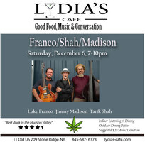 Saturday 7:00 pm to 10:00 pm | Franco/Shah/Madison, Luke Franco – guitar, Tarik Shah – bass, Jimmy Madison – drums Jazz | Lydia's Cafe & Bar 7 Old US Highway 209 Stone Ridge, NY See Map |