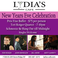 Wednesday 7:00 pm to 11:59 pm | NYE Jazz Buffet w/ Teri Roiger Quartet, Teri Roiger - vocals, John Menegon – bass, Bill Ware – vibraphone, Matt Garrity - Drums Jazz | Lydia's Cafe & Bar 7 Old US Highway 209 Stone Ridge, NY See Map |