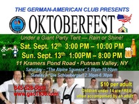 | OKTOBERFEST TIME!! At the German American Social Club - Under a GIANT Party Tent - Rain or Shine! Featuring LIVE Bands: "The Alpine Squeeze" Sat Sept 12th & "Die Schlauberger" Sun Sep 13th. Come to a relaxing country setting in Putnam Valley to enjoy Live music & a variety of German & American foods, along with imported beers, Viennese Cafe & Oktoberfest pretzels! There will be activities for the kids & a FREE bouncy tent too! Indoor clubhouse bar, Free ample parking, ATM on premises.