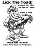 WELL LICK THE TOAD RETURNS TO THE INN AT LEEDS!!! (KNOWN TO THE LOCALS AS THE IRISH CENTER!).....THIS IS A GREAT PLACE LOT'S OF BEER TO CHOOSE FROM.....LOT'S OF VODKA, TEQUILA, WHISKEY ...YOU GET THE PICTURE!! GREAT FOOD THE BEST STAFF!!! AND LOT'S OF ROOM TO HANG OUT , PARTY, DANCE ETC!!! SO.......ARE YOU READY FOR SOME ROCK N' ROLL BY THE LIKES OF TOM PETTY, ALICE COOPER, THE BEATLES, THE STONES, THE KINKS. MAYBE A LITTLE 40TH. ANNIVERSARY OF THE ROCKY HORROR PICTURE SHOW CELEBRATION??.......WELL ARE YOU??? THEN COME ON OUT AND PARTY WITH THE BAND YOUR PARENTS WARNED YOU ABOUT!!! LICK THE TOAD!!!! .........SEE YA THERE!STUFF | ||