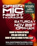 Saturday 10:00 pm to 1:00 am | Open Mic/ Karaoke Acoustic | Walsh's Town Tavern Patterson, NY See Map |