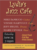 Saturday 7:00 pm to 10:00 pm | Mike DeMicco - guitar, Vinnie Martucci - keys, Jeff Siegel - drums, Mark Usvolk - bass Jazz | Lydia's Cafe & Bar 7 Old US Highway 209 Stone Ridge, NY See Map |