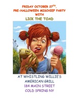 WELL THE NIGHT BEFORE THE BIG COSTUME PARTIES!! SORRTA LIKE MISCHIEF NIGHT ONLY DIFFERENT! LICK THE TOAD WILL BE KICKING IT UP A NOTCH IN COLD SPRING AT WHISTING WILLIE'S AMERICAN GRILL!! SO GET READY FOR SOME ROCK N' ROLL!! WE CAN'T WAIT TO SEE YOU THERE!STUFF | ||