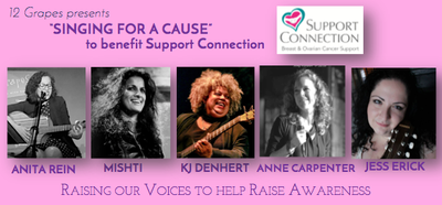 In honor of Breast Cancer Awareness month, 12 Grapes presents "Singing for a Cause". Top female artists come together to raise their voice in song and raise awareness for breast cancer. All donations will benefit Support Connection, Inc. of Yorktown Heights.RAFFLE PRIZES include: Four tkts to Broadway's Phantom of the Opera; Jacob Burns Memberships; 2 Giants tkts; Paramount tkts; Gift Certificates to local stores & restaurants and more! All for a good cause. Live Music from 7:30-10pm. All-night Happy Hour & $10 Burger Special! Support Connection, Inc. is a not-for-profit organization that provides counseling and other support services to women and families affected by breast and ovarian cancer. All services are free of charge. To learn more, visit www.supportconnection.org. While this wonderful organization is based in Yorktown, they offer support nationwide throughout their toll-free cancer support line: 800-532-4290. **$20 suggested (or higher) donation at the door DONATE TO SUPPORT CONNECTION | ||