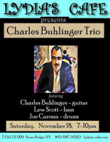 Saturday 7:00 pm to 10:00 pm | Charles Buhlinger Trio, Lew Scott - bass, Joe Carozza - drums Jazz | Lydia's Cafe & Bar 7 Old US Highway 209 Stone Ridge, NY See Map |