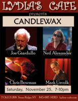 Saturday 7:00 pm to 10:00 pm | Candlewax, Joe Giardullo - sax, Neil Alexander - keys, Chris Bowman - drums, Mark Usvolk - bass Jazz, Motown/R&B | Lydia's Cafe & Bar 7 Old US Highway 209 Stone Ridge, NY See Map |