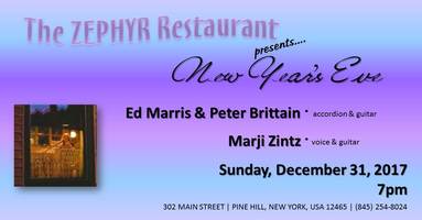 Sunday 7:00 pm | New Year's Celebration! with Marji Zintz, Ed Marris & Peter Brittain Acoustic, Jazz | Zephyr Restaurant 302 Main Street Pine Hill, NY See Map |