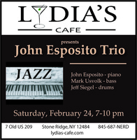 Saturday 7:00 pm to 10:00 pm | John Esposito Trio, John Esposito - piano, Mark Usvolk - bass, Jeff Siegel - drums Jazz | Lydia's Cafe & Bar 7 Old US Highway 209 Stone Ridge, NY See Map |
