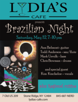 Saturday 7:00 pm to 10:00 pm | Brazilian Night, Ann Belmont - guitar/vocals, Todd Anderson - sax, Chris Bowman - drums, Mark Usvolk - bass, Kim Kincheloe - vocals Latin, Jazz | Lydia's Cafe & Bar 7 Old US Highway 209 Stone Ridge, NY See Map |