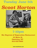 Tuesday 7:00 pm to 10:00 pm | Live Music and Good Food with Scoot Horton Acoustic, Country, and Folk/Traditional. alt country | Six Degrees of Separation 35 Main St Ossining, NY See Map |