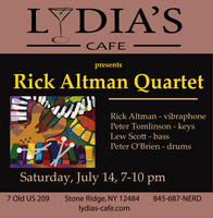 Saturday 7:00 pm to 10:00 pm | Rick Altman - vibraphone, Peter Tomlinson - keys, Lew Scott - bass, Peter O'Brien - drums Jazz, Latin | Lydia's Cafe & Bar 7 Old US Highway 209 Stone Ridge, NY See Map |