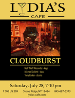 Saturday 7:00 pm to 10:00 pm | Cloudburst, Neil Alexander - keys, Michael Coletti - bass, Tony Parker - drums Funk, Jazz | Lydia's Cafe & Bar 7 Old US Highway 209 Stone Ridge, NY See Map |