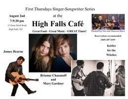 ![]() Thursday 7:00 pm to 9:30 pm | First Thursdays Singer Songwriter Series with Don and Maureen Black, James Hearne, Brianne Chasanoff and Mary Gardner, Kettles For The Witches Singer-Songwriter | High Falls Cafe 12 Stone Dock Road High Falls, NY See Map |