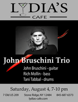 Saturday 7:00 pm to 10:00 pm | John Bruschini Trio, John Bruschini - guitar, Rich Mollin - bass, Tani Tabbal - drums Jazz | Lydia's Cafe & Bar 7 Old US Highway 209 Stone Ridge, NY See Map |