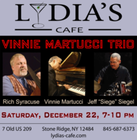 Saturday 7:00 pm to 10:00 pm | Vinnie Martucci Trio, Vinnie Martucci - piano, Rich Syracuse - bass, Jeff Siegel - drums Jazz | Lydia's Cafe & Bar 7 Old US Highway 209 Stone Ridge, NY See Map |