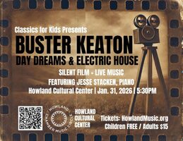 with live music by Jesse Stacken, piano Back by popular demand! Classics for Kids presents a special screening of two beloved Buster Keaton classics—Day Dreams and Electric House—presented by the Howland Chamber Music Circle and the Howland Cultural Center. Enjoy Keaton’s hilarious antics on the big screen with live piano accompaniment by Jesse Stacken, recreating the authentic movie-house experience of a century ago. More information and Admission Purchase | ||