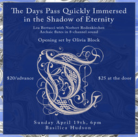 Sunday 6:30 pm to 8:00 pm | "The Days Pass Quickly Immersed in the Shadow of Eternity" with Lea Bertucci Alternative | Basilica Hudson 110 S Front St. Hudson, NY See Map |