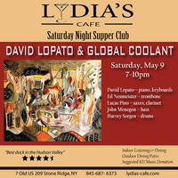 Saturday 7:00 pm to 10:00 pm | David Lopato & Global Coolant, David Lopato – piano, keyboards, Ed Neumeister – trombone, Lucas Pino – saxes, clarinet, John Menegon – bass, Harvey Sorgen – drums Jazz | Lydia's Cafe & Bar 7 Old US Highway 209 Stone Ridge, NY See Map |