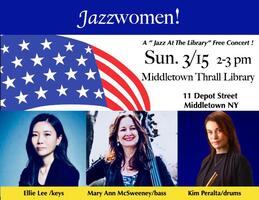 The Jazzwomen Trio take the stage in Middletown for their 2nd appearance in a month-long "Jazz at the Library" tour of free concerts celebrating Women's History Month and generously funded by our public libraries. Featuring pianist Ellie Lee, bassist Mary Ann McSweeney and drummer Kim Peralta.Jazzwomen Website | ||