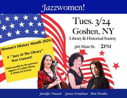 Tuesday 2026 2:00 pm to 3:00 pm | Jazz in Goshen with Jazzwomen! Jazz | Goshen Library & Historical Society 366 Main Street Goshen, NY See Map |