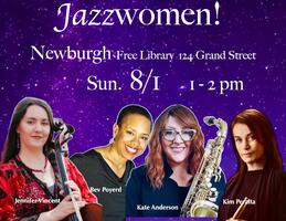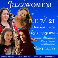 Tuesday 6:30 pm to 7:30 pm | Live Jazz in Monticello! with Jazzwomen!, Jenny Hill/sax/flute, Sarah Jane Cion/keyboards, Jennifer Vincent/double bass, Kim Peralta/drums Jazz | Ethelbert B. Crawford Public Library 479 Broadway Monticello, NY See Map |