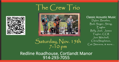 Come sing along to classic tunes from great artists such as Dylan, Beatles, Chris Stapleton, Billy Joel, Bob Seger, Kacey Mugraves, Simon & Garfunkel, CSNY, Eagles, Cat Stevens, Joni Mitchell, and many more. The Crew Trio includes: Mike Kiernan - Lead Vocals/Acoustic Guitar Bob Hauver - Lead Vocals/Acoustic Guitar Rick Ecker - Fretless Bass/ Harmonies (914) 293-7055 No Cover Charge. Full Menu | ||