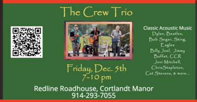returns to The Redline Roadhouse - Friday, Dec. 5th! Come sing along to classic tunes from great artists such as Dylan, Beatles, Chris Stapleton, Billy Joel, Bob Seger, Kacey Mugraves, Simon & Garfunkel, CSNY, Eagles, Cat Stevens, Jimmy Buffet and many more. The Crew Trio includes: Mike Kiernan - Lead Vocals/Acoustic Guitar Bob Hauver - Lead Vocals/Acoustic Guitar Rick Ecker - Fretless Bass/ Harmonies (914) 293-7055 No Cover Charge. Full Menu | ||