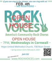 Wednesday 7:00 pm to 9:00 pm | ROCK VOICES CHOIR Open call for all singers with Rock Voices of the Hudson Valley Rock (classic), Covers. More fun then karaoke! | Hope United Methodist church 198 Main Street Cornwall, NY See Map |
