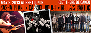 Thursday 8:00 pm to 11:30 pm | LET THERE BE CAKE with Caprice Rouge, Sasha Pearl, Bella's Bartok World, Folk/Traditional, and Singer-Songwriter. Gypsy-Punk, Balkan, Klezmer and more | BSP Lounge 323 Wall Street Kingston, NY See Map |