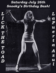YUP! IT'S SNOOKY'S BIRTHDAY! AND WE ARE CELEBRATING IN WILD-ASS ROCK N' ROLL STYLE AT LA PUERTA AZUL! SNOOKY AND HER SISTER TISH ARE THE PROPRIETORS OF MANIC PANIC AND THEY ARE BOTH (ALONG WITH OUR BASS PLAYER ANDY BALE WHO IS SNOOKY'S HUSBAND) STILL MEMEBERS OF THE SIC F*CKS! AND WE ARE ALSO CELEBRATING THE RETURN OF LEN CORMAN BACK BEHIND HIS DRUMS AFTER HIS RECENT STROKES.........SO THIS WILL BE A REAL CELEBRATION OF LIFE IN THE USUAL LICK THE TOAD MANOR! SO COME ON OUT AND JOIN THE PARTY! ...........AND REMEMBER.......... YOU NEVER KNOW WHO'S GONNA SHOW UP WHEN LICK THE TOAD COMES TO TOWN!STUFF | ||