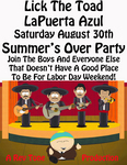 YUP! IT'S THE LAST SATURDAY OF THE MONTH AND THE UNOFFICIAL END OF SUMMER......LABOR DAY WEEKEND! SO LET'S TAKE THIS SUMMER OUT ON A HIGH NOTE!! COME ON OUT TO LA PUERTA AZUL AND PARTY WITH LICK THE TOAD!! SEE YA THERE!STUFF | ||