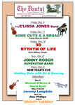 The party's not over yet! Celebrate the first day of 2016 with Thrown Together ... "Not your mother's cover band". Get ready to dance to all your favorite classic Rock -- a wide range of hits and "Dirty Dancing" party music from bands like The Allman Brothers, The Beatles, Pink Floyd, Sublime, Primus... from Jimmy Buffett and Marvin Gaye to Aerosmith and so much more. The band features Ryan O'Connor (vocals/guitar), John DeSanto (drums/vocals), Andy Fennell (bass/vocals), and Tom Dillon (guitar). This band packs the house so Dinner & Show reservations are highly recommended. **$5 Entertainment Fee for all, including diners** Entertainment Fee goes directly to the band. Thank you for supporting live music. | ||