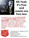 The Salvation Army is hosting Open Mic Night every 2nd and 4th Fridays of the month at 7pm to 9pm. This is a safe place for young people (ages 14 and up) to feel free to express themselves through music, poetry, drama or dance. The rules are that there will be no obscenities, violence or suggestive lyrics or movements. If you are performing, sign in is at 6:45pm