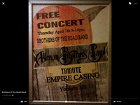 ![]() Thursday 8:00 pm to 11:00 pm | * * * Allman Brothers & Dickey Betts Fans with The Brothers of the Road Band Blues, Rock (classic), and Jazz. Allman Brothers Tribute | Empire Casino Yonkers, NY See Map |