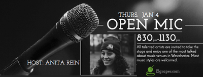 ![]() Thursday 8:30 pm to 11:30 pm | Open Mic Night - The FIRST Thursday each month! with tonight's host, Anita Rein Open Mic | 12 Grapes Music & Wine Bar 12 North Division Street Peekskill, NY See Map |