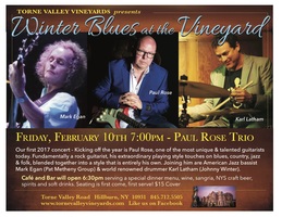 Friday 7:00 pm to 10:30 pm | Winter Blues with The Paul Rose Trio, Mark Egan, Karl Latham Blues, Rock (classic), and Rock (progressive) | Torne Valley Vineyards 1 Torne Brook Road Hillburn, NY See Map |
