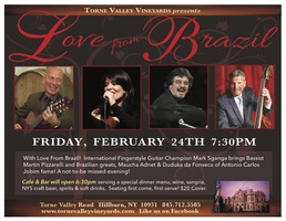 Friday 7:30 pm to 10:30 pm | Love From Brazil! with Mark Sganga, Martin Pizzarelli, Maucha Adnet, Duduka da Fonseca Jazz, Latin | Torne Valley Vineyards 1 Torne Brook Road Hillburn, NY See Map |