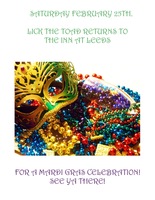 LICK TOAD RETURNS TO THE INN AT LEEDS!! FOR A MARDI GRAS CELBRATION THE SATURDAY BEFORE FAT TUESDAY!!! SO COME ON OUT FOR SOME WILD-ASS ROCK N' ROLL AND BEADS!!! WE CAN'T WAIT TO SEE YOU IT'S BEEN TO LONG SINCE WE HAVE BEEN AT THE INN AT LEEDS WITH ALAN AND JOHN AND THEIR GREAT STAFF!!! SO COME ON OUT AND MARDI GRAS PARTY WITH THE THE BAND YOUR PARENTS WARNED YOU ABOUT ......... LICK THE TOAD!!! SEE YA THERE!!!!STUFF | ||