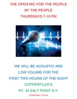 NEW LOCATION! THE OPEN MIC FOR THE PEOPLE BY THE PEOPLE HAS MOVED TO COPPERFIELD'S BAR & RESTAURANT 2571 RT 44 SALT POINT NY......WE WILL BE CHANGING A FEW MINOR THINGS.......FIRST THE TIME......7-10 PM! THEN FROM 7-9 WILL BE ACOUSTIC AND LOW VOLUME AND THE LAST HOUR WILL BE ELECTRIC AND ANY LOUDER (WE STILL RESERVE THE RIGHT AS THE HOSTS TO CONTROL VOLUME!) AS ALWAYS WE WILL SUPPLY THE BACK LINE THE PA AND THE DRUM KIT.... SPOKEN WORD IS WELCOME STILL AND STAND UP COMEDY AS WELL THIS IS STILL ABOUT THE PERFORMERS AND IT IS NOT ABOUT THE HOSTS!! WE LOOK FORWARD TO SEEING YOU ALL! | ||