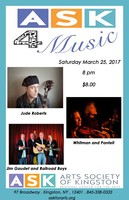 Saturday 8:00 pm to 10:00 pm | March ASK for Music, Jude Roberts, Jim Gaudet and Railroad Boys, Whitman and Pantell Singer-Songwriter, Folk/Traditional, and Acoustic | Arts Society of Kingston (ASK) 97 Broadway Kingston, NY See Map |