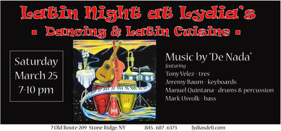 Saturday 7:00 pm to 10:00 pm | De Nada Latin | Lydia's Cafe & Bar 7 Old US Highway 209 Stone Ridge, NY See Map |