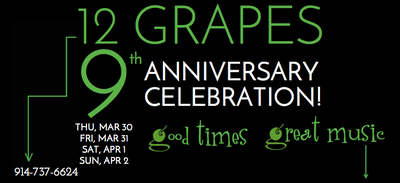 ![]() Thursday 8:29 pm to 11:59 pm | It's our 9th Anniversary! with Amazing Live Music All Weekend Long! | 12 Grapes Music & Wine Bar 12 North Division Street Peekskill, NY See Map |
