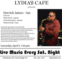 Saturday 7:00 pm to 10:00 pm | Saxophonist Derrick James, Matt Finck - guitar, Chris Bowman - drums, Mark Usvolk - bass Jazz, Motown/R&B | Lydia's Cafe & Bar 7 Old US Highway 209 Stone Ridge, NY See Map |