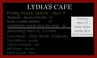 Saturday 7:00 pm to 10:00 pm | Guitarist Tom DePetris, Charles Frommer - sax, Jeff Siegel - drums, Mark Usvolk - bass Jazz, Blues, and Latin | Lydia's Cafe & Bar 7 Old US Highway 209 Stone Ridge, NY See Map |