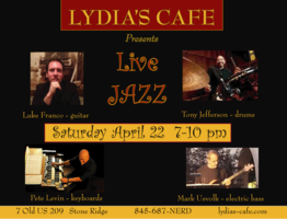 Saturday 7:00 pm to 10:00 pm | Luke Franco - guitar, Pete Levin - keyboard, Tony Jefferson - drums, Mark Usvolk - bass Jazz, Motown/R&B, and Latin | Lydia's Cafe & Bar 7 Old US Highway 209 Stone Ridge, NY See Map |