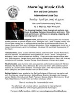The Amazing Stephen Fuller Quartet will perform Jazz, Blues, Broadway, Calypso, Bossa Nova and more. This lively performance will have you singing, clapping, and dancing in your seats.The afternoon will conclude with an opportunity to meet and greet new and old friends while enjoying dessert and champagne. There is no charge for this wonderful eventMorning Music Club Meet and Greet | ||