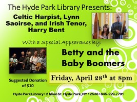 Friday 8:00 pm | An Evening of Irish (and American) Music with Celtic Harpist Lynn Saoirse, Irish Tenor HarryBent, Betty and the Baby Boomers Irish (traditional), Folk/Traditional, and Singer-Songwriter | Hyde Park Free Library Annex 2 Main St. Hyde Park, NY See Map |