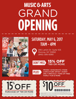 Saturday 11:00 am to 4:00 pm | Store Grand Opening | Music & Arts 290 Larkin Drive, Suite 103 Monroe, NY See Map |