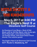 The Eagle's Nest proudly presents an evening of live blues music with LITTLE SCOTTY & THE KNOCKOUTS, an all-star lineup featuring Steve Repka on guitar, Lewis Greeney on bass, Jon Scanlon on keyboard & Kevin Flaherty on drums. In other words it's going to be a blues guitar and jazz/funk party extravaganza. Playing real traditional blues music live brought to you by one of the best blues bands in the area. Special Guests TBA. Not to mention Great Drinks and Food! @ the Eagle's Nest 2 on Dinsmore Golf Course (off Route 9 in Staatsburg)- Friday Night Classic Car & Bike cruise with Live Music!!! Outside BBQ (weather permitting) May 5th @ 7pm. It’ll be a great evening of music! | ||