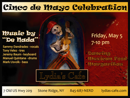 Friday 7:00 pm to 10:00 pm | De Nada Latin | Lydia's Cafe & Bar 7 Old US Highway 209 Stone Ridge, NY See Map |